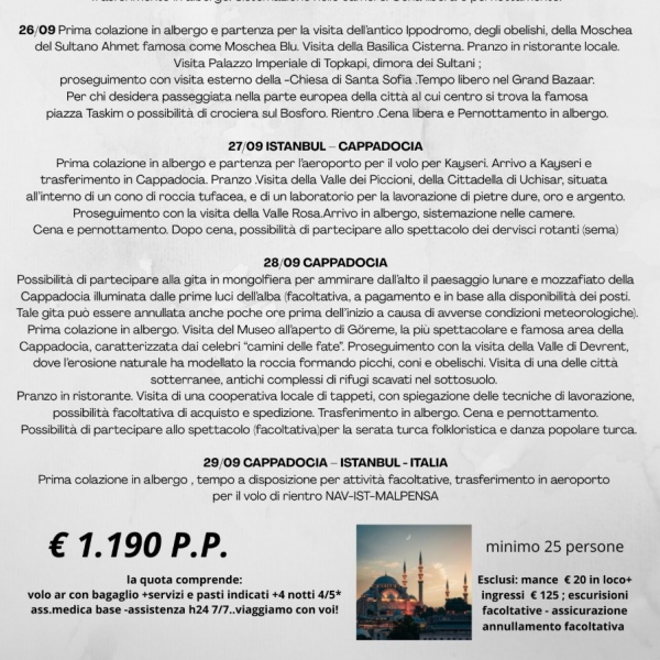 Ci sono viaggi che si fanno con la valigia…E poi ci sono quelli che si fanno con il cuore! Dal 25 al 29 settembre #partyconnoi in un viaggio magico dove Oriente e Occidente si sfiorano tra minareti, bazar profumati di spezie e paesaggi che sembrano usciti da un sogno!