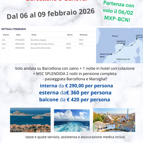 Ti proponiamo questa mini crociera dal 06/02 al 09/02 con partenza da Barcellona!